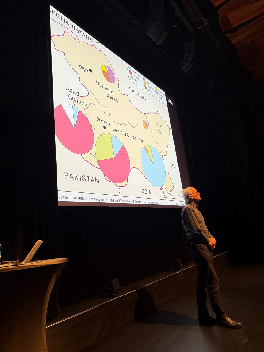 Indien-Pakistan, dass das keine Erzählung über eine tiefe politische Freundschaft werden würde, war bekannt. Was Hermann Kreutzmann in seinem GeoComPass-Vortrag am 11. November 2025 darlegte, überraschte in seiner Deutlichkeit dann doch: Von einer nahezu hermetisch abgeriegelten Grenze über mehrere 1.000 km voneinander getrennt, leben hier in Südasien ein 1,4-Milliarden- und ein 250-Millionen-Volk gleichsam ohne wirkliche Kontakte, ohne großen Handel und ohne materiellen Austausch nebeneinander her und verdrängen dabei die jeweils andere Perspektive ihres Gegenübers. Hermann Kreutzmanns brillante Ausführungen hielten die fast 150 Gäste von der ersten bis zur letzten Minute in ihren Bann: Geographie vom Feinsten, „geography at its best” – und langanhaltende Ovationen für eine außergewöhnliche Vortragsleistung!